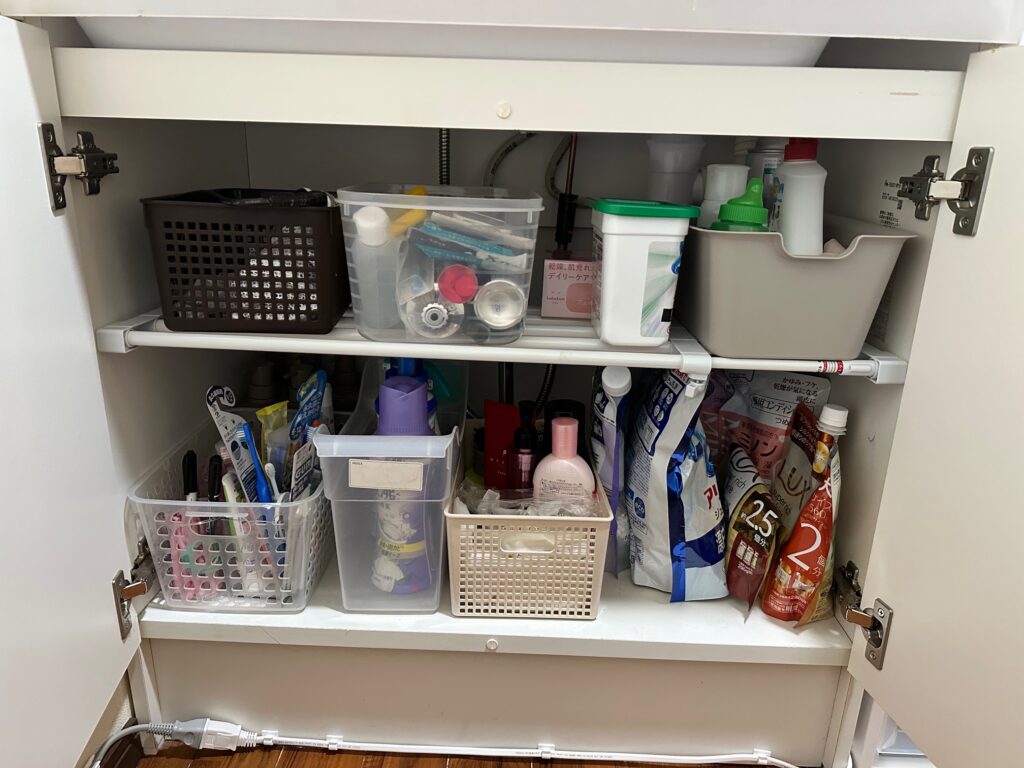 手持ちのカゴなどを活用して整えることで、洗面台下は必要なものだけがすっきり収まり、上部も見た目が整いました。