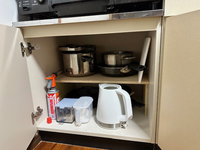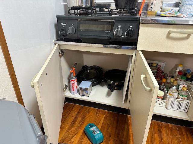 コンロ下に棚板をDIYで追加し、収納力をアップしました。